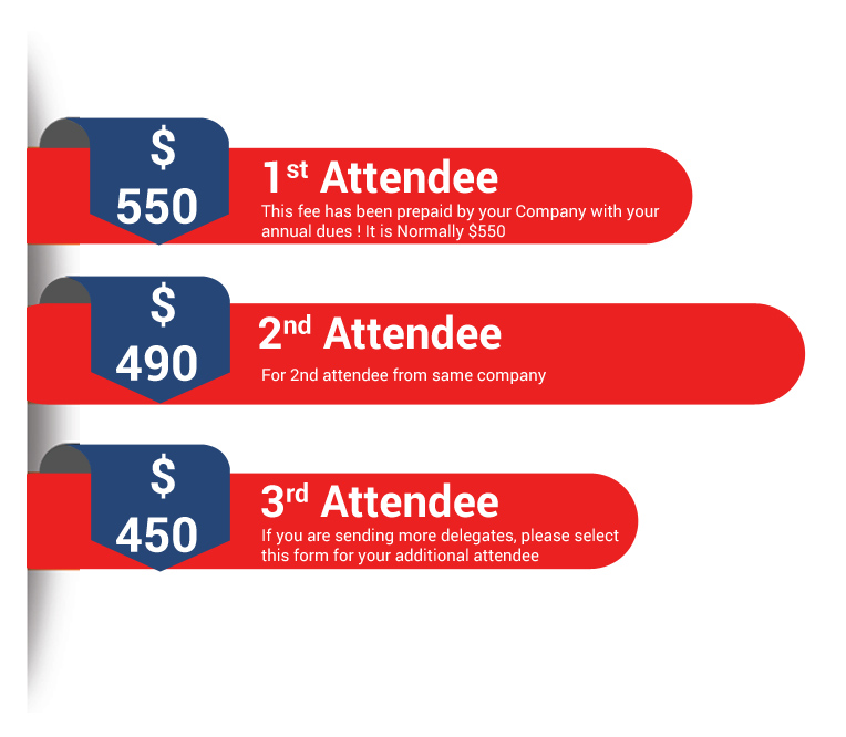 As normal, the first attendee fee will be invoiced with your annual dues. Any other attendees, spouses etc will be invoiced to our members and this year we are pleased to announce that these fees can be paid by Credit Card! Should you wish to make use of this facility, please email lynn@ctngroup.com and an invoice will be raised and submitted to you to pay via Credit Card. There will be a 2.5% credit card fee added to the invoice!